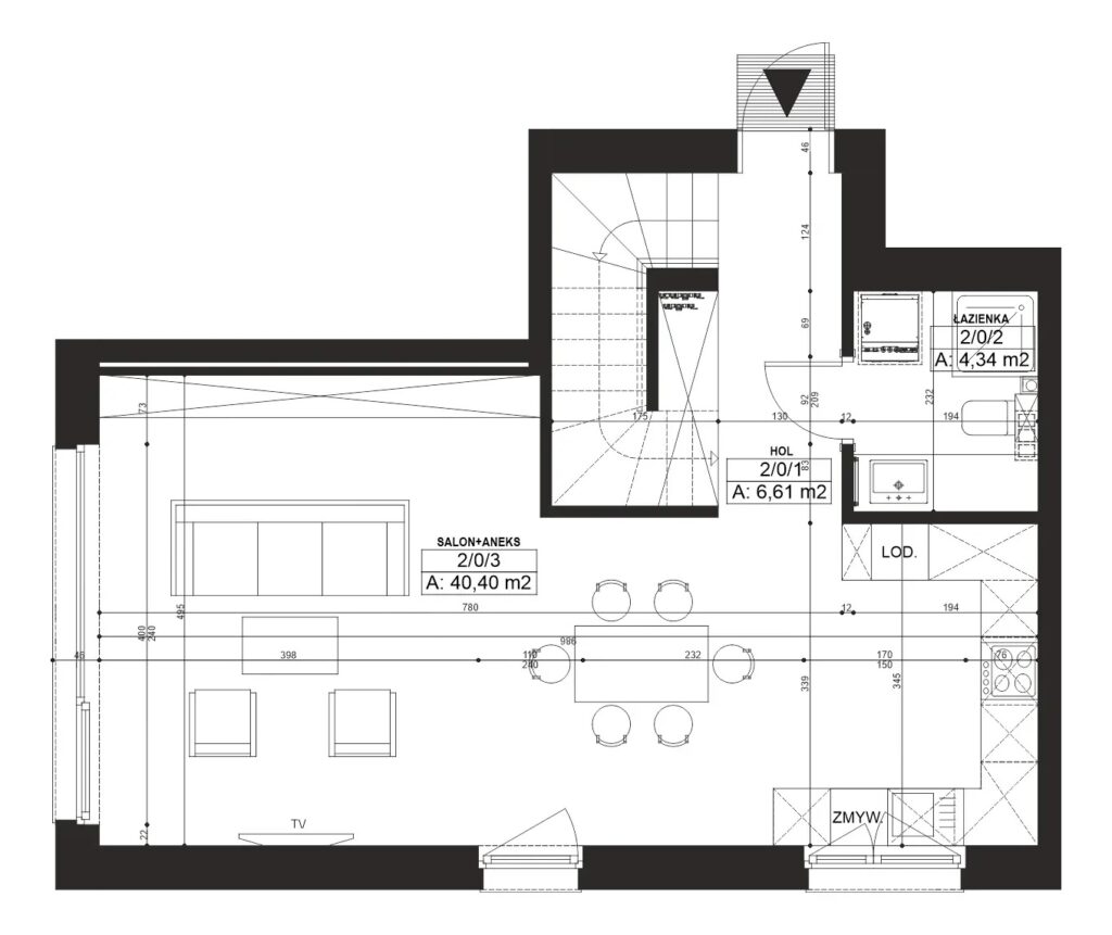 - Przestronny salon z aneksem kuchennym – 40,40 m²